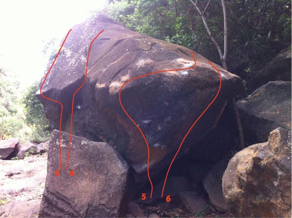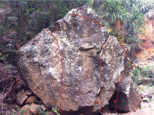 Voici le topo du secteur « le Bloc » à Bassin Plat …. ainsi nommé car il y a UN bloc. Pour s’y rendre c’est facile : vous descendez la grande echelle qui mène aux voies d’escalades, puis continuez à descendre. Le bloc est 20m en amont.