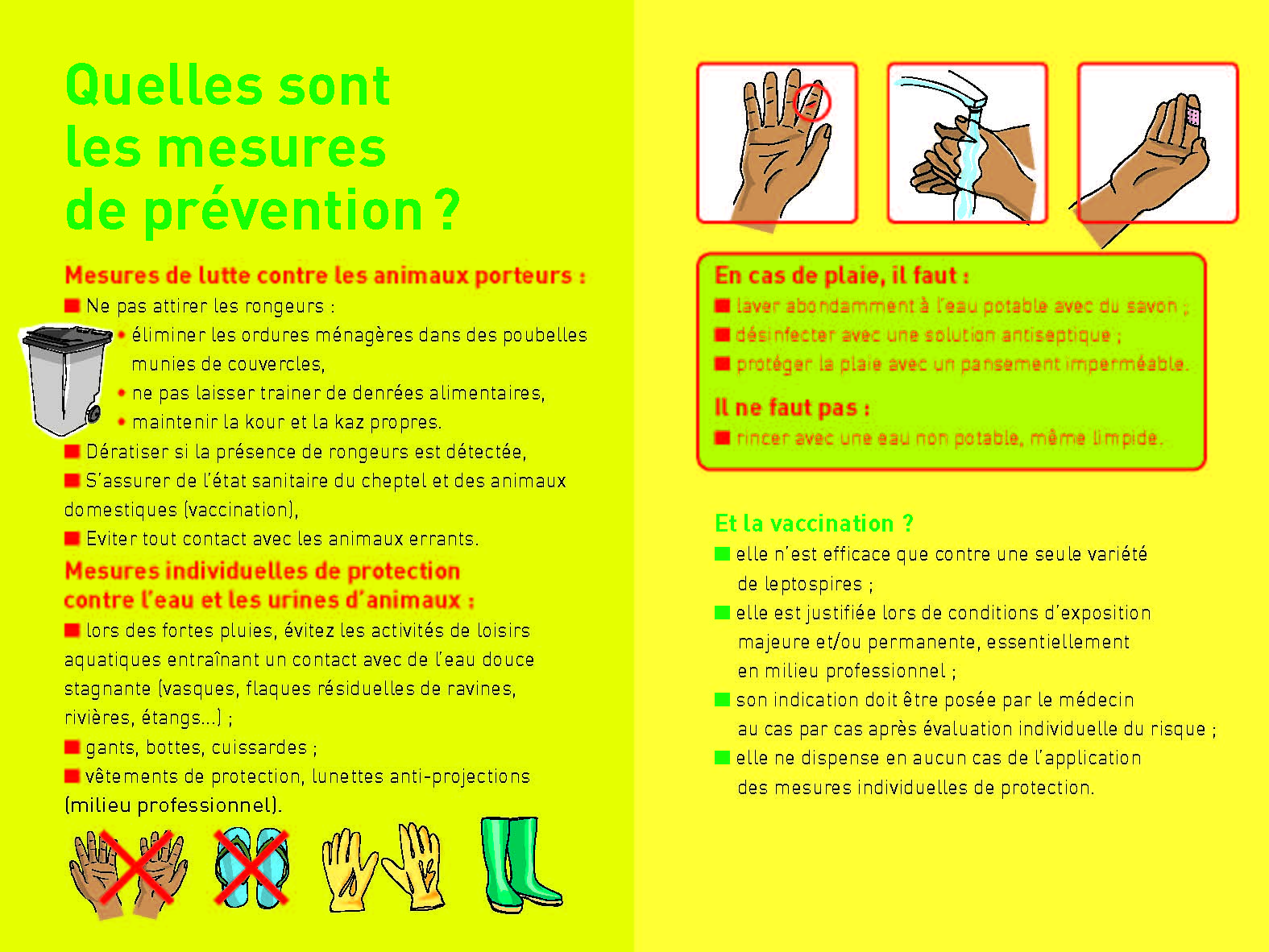 Afin de limiter les risques de contracter la leptospirose, quelques règles simples doivent être respectées, suite à de fortes précipitations :