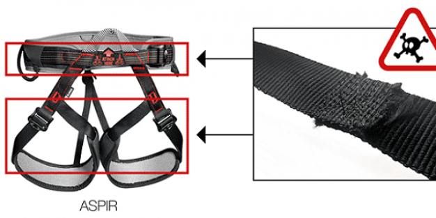 Ces harnais neufs ou légèrement usés ont été modifiés par des tiers irresponsables après leur mise sur le marché. Les sangles de sécurité des cuisses ou ceinture de ces harnais ASPIR modifiés ont été coupées puis recousues.
