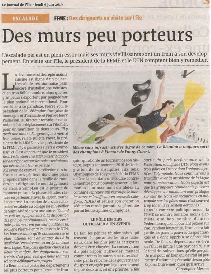 La ligue Réunion a le plaisir d’accueillir du 05 au 06 juin,  Pierre YOU , président de la Fédération Française de la Montagne et d’Escalade, ainsi que Pierre-Henri PAILLASSON, DTN de la FFME.