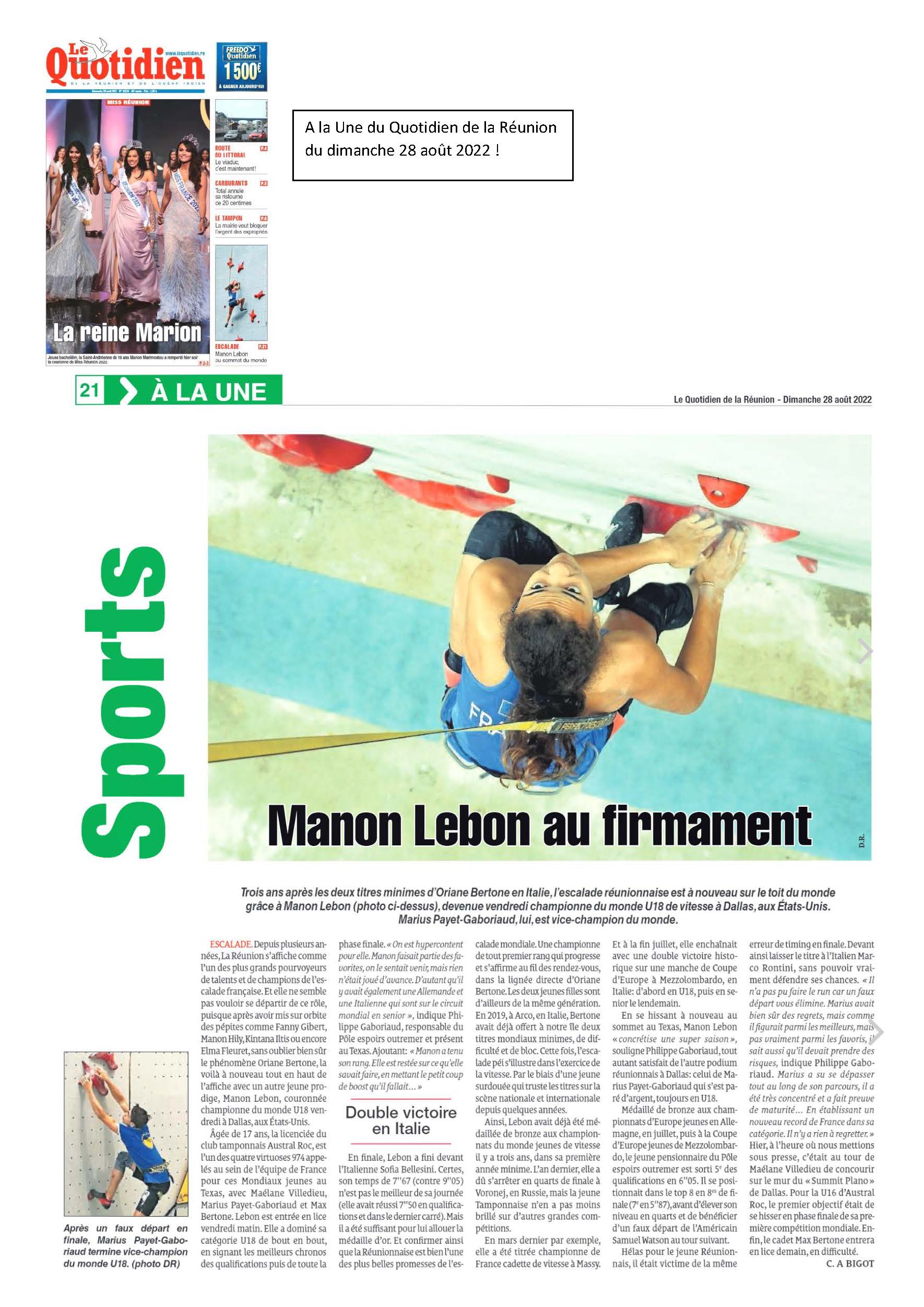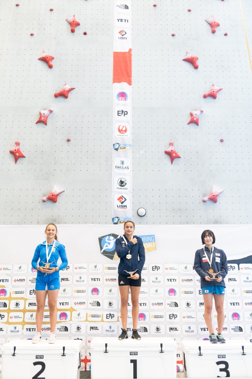 Manon, la récente vainqueure d’une Coupe d’Europe Jeune et d’une Coupe d’Europe Sénior à Mezzolombardo fin juillet, donne le ton et se détache de la concurrence dès les qualifications en prenant la tête du classement, avec un temps de 7’’50 secondes. Durant les duels de la phase finale, elle domine tour à tour chacune ses adversaires, et se hisse en grande finale. Imperturbable face à l’italienne Sofia BELLESINI dans l’ultime run, la française du Pôle-Espoir Outre-Mer démarre fort et garde l’avantage jusqu’ en haut pour s’offrir la médaille d’or en 7’’67. C’est la consécration pour Manon, qui remporte à Dallas son premier titre de Championne du Monde et s’impose comme la meilleure performeuse mondiale en U18 avec des chronos réguliers sous les 7’’60.