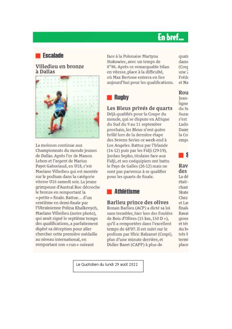 En attendant les épreuves de difficulté où Max BERTONE est attendu en demi-finale mercredi (31 août), Maélane complète la collection de médailles réunionnaises !