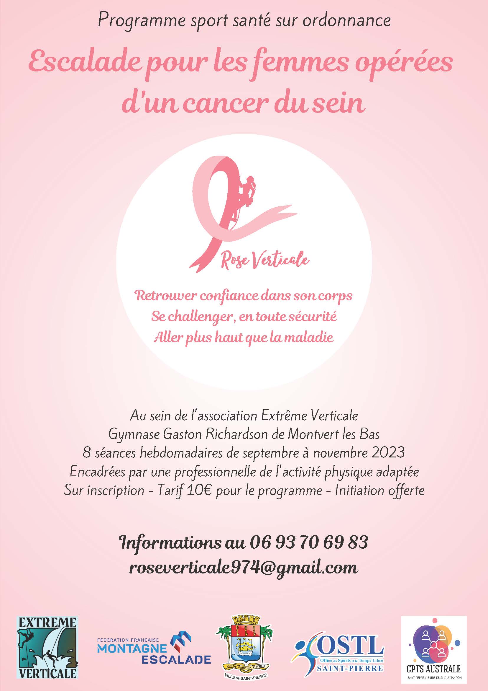 Dans le cadre de son projet sport santé « Rose Verticale », le club Extrême Verticale (Montvert) propose à partir de septembre un programme d’activité adapté auprès de femmes opérées d’un cancer du sein, une première à la Réunion !  Vous retrouverez ci-dessous toutes les informations sur ce projet.