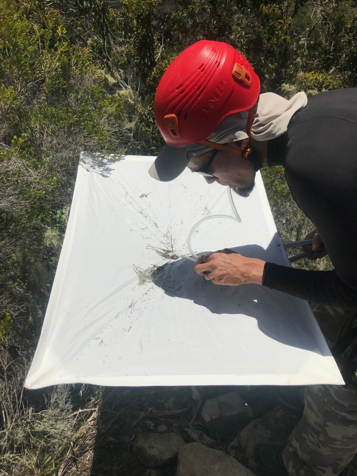 Grégory CAZANOVE, aranéologue et entomologiste du Muséum d’histoire naturelle, est ravi : « Je suis Grégory du Muséum d’histoire naturelle de La Réunion, accompagné de Brice. Nous sommes membres de ‘Mission Spider- Antenne La Réunion’. Nous étudions les araignes de La Réunion et nous n’avons aucune connaissance d’inventaire d’araignées sur le site du Piton de Sucre. Donc ce sera une première pour La Réunion. Je vais faire du battage de la végétation, et tous les insectes et araignées qui vivent dans cette végétation vont se retrouver sur le drap blanc. Je vais ensuite pouvoir collecter les bêtes avec un aspirateur à bouche puis les identifier. »