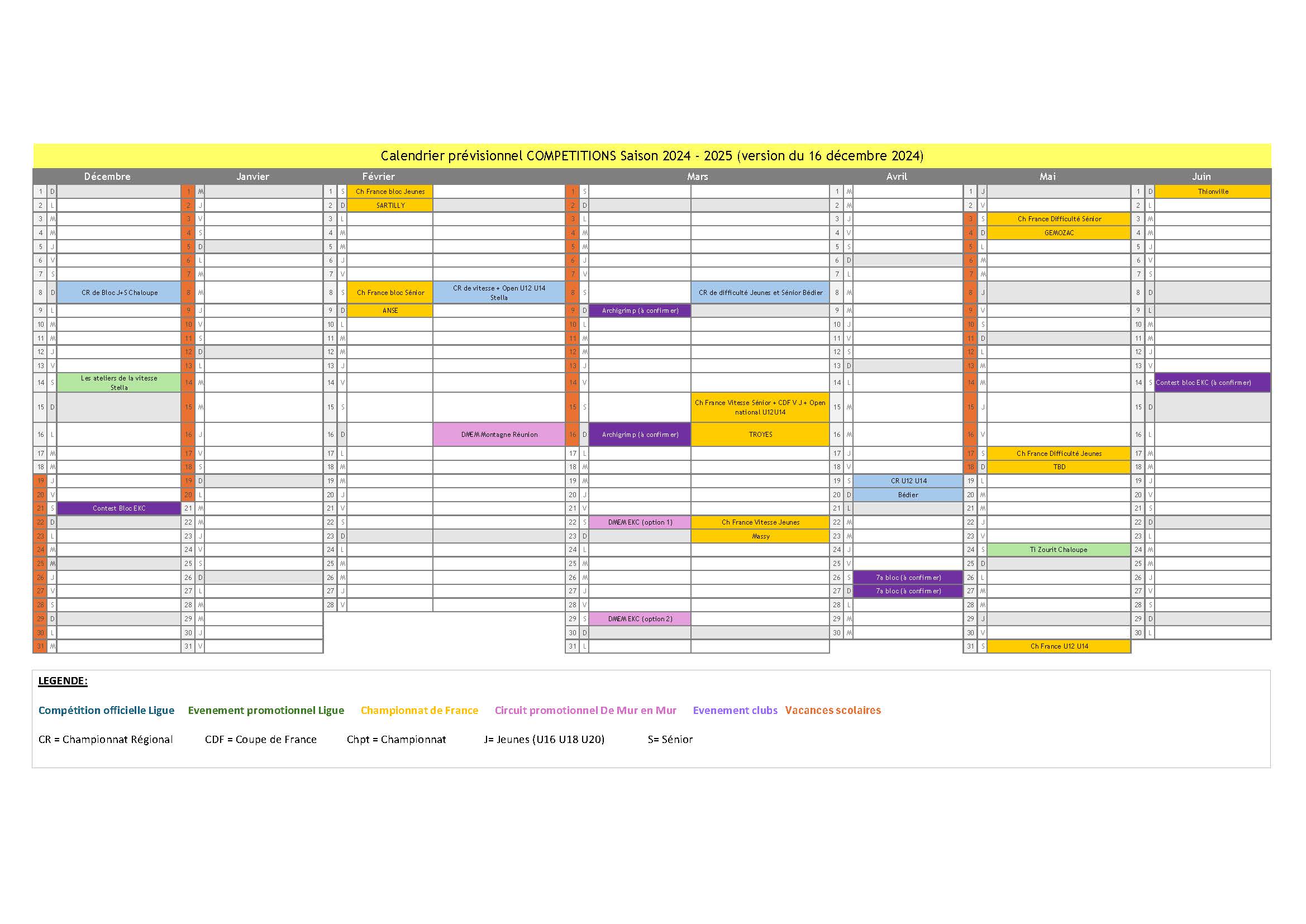 Calendrier prévisionnel compétitions