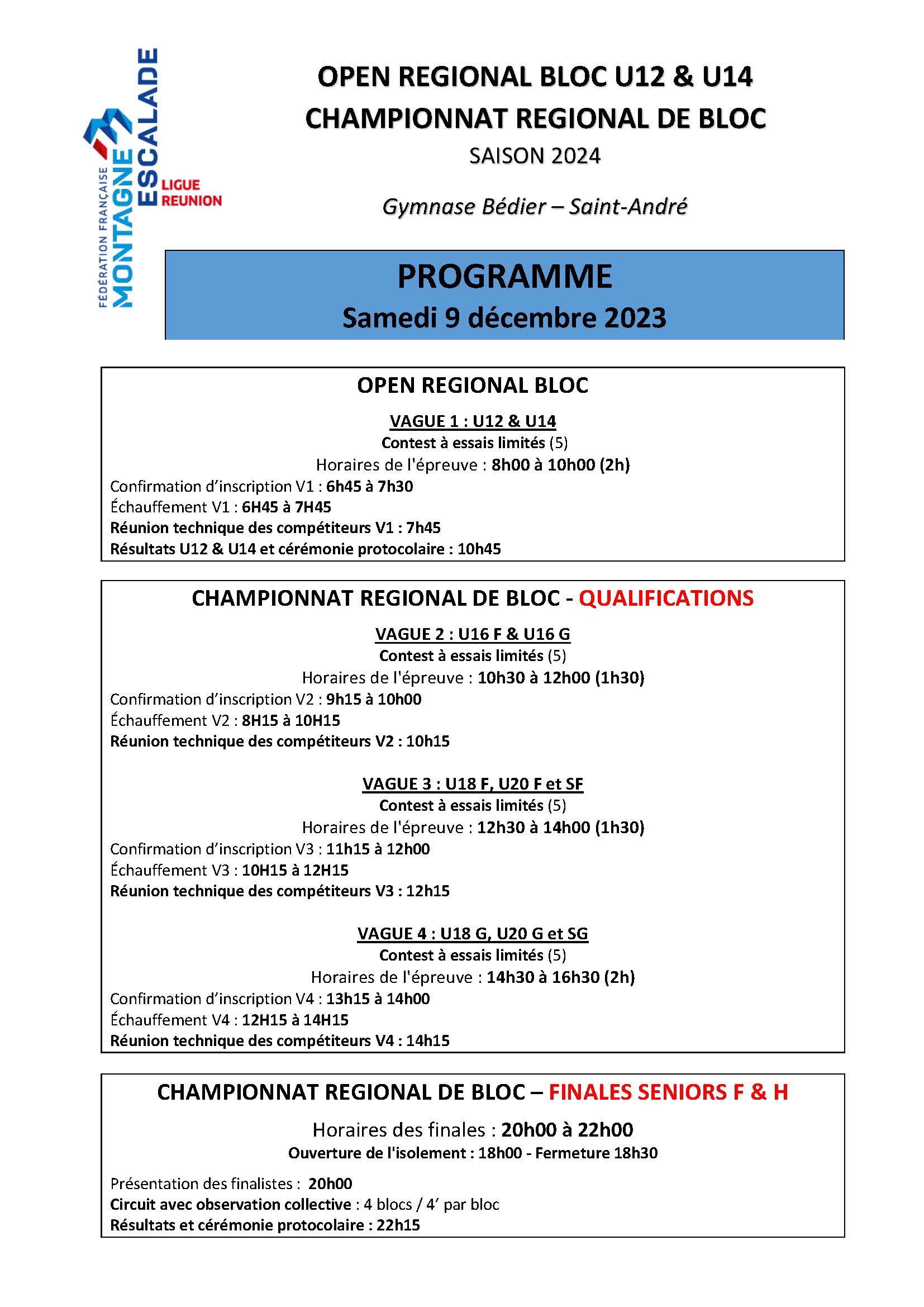 Lieu de compétition : Gymnase Bédier à Saint André (point GPS)