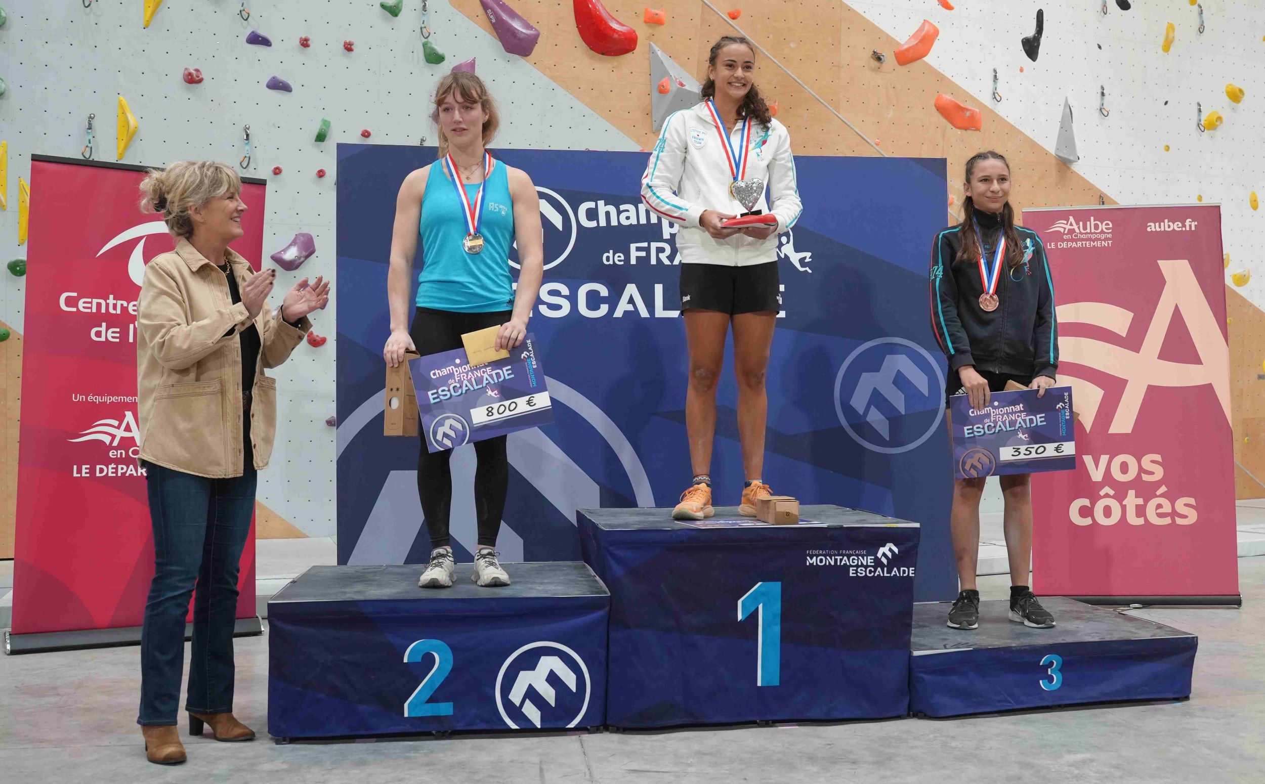 La tamponnaise était bien entournée, les deux autres représentantes réunionnaises faisaient également partie du dernier carré. Eva-Lina RYMASZ (Austral Roc), vainqueure sur le fil en quarts, s’incline malgré un beau passage en demies contre Capucine VIGLIONE. A l’instar de sa coéquipière, Louise FONTAINE (Est’Kalad Club) remporte de très peu son quart de finale, avant de s’incliner contre Manon en demies. C’est ainsi que la petite finale opposera les deux coéquipières du Pôle Espoir. Au coude à coude de bout en bout, et remporte finalement le bronze pour moins de 5 centièmes, sa première médaille nationale en sénior. Elle améliore également son record personnel en 7’’70.