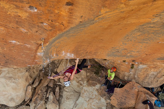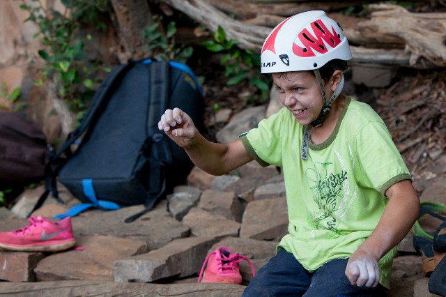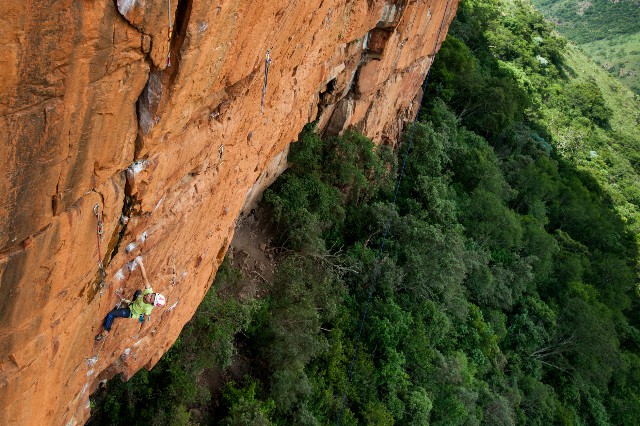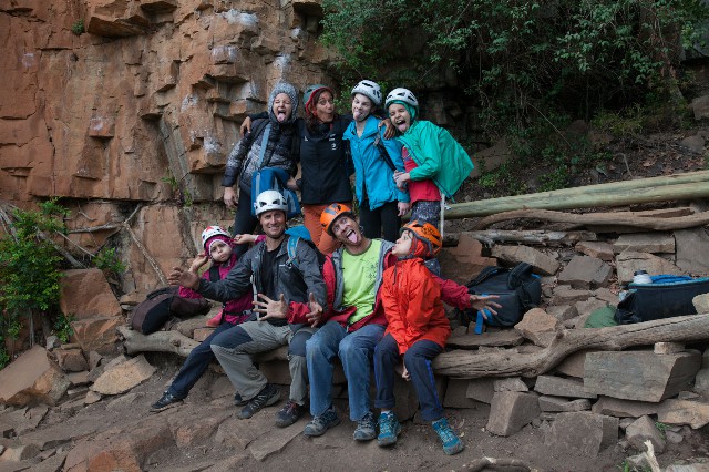 Notre nouvelle destination, contrairement à Wow Prow, offre un choix important de voies de tout niveau (plus de 900 voies à Boven pour moins d’une dizaine à Wow Prow !). Ici les falaises s’étendent sur plusieurs kilomètres surplombant un canyon sauvage et verdoyant. Pas de prairie avec troupeaux de ruminants dans cet autre décor de carte postale, mais des forêts denses, fréquentées par une multitude d’oiseaux et des babouins méfiants dont les cris emplissent parfois le fond du canyon. Les orages pourtant fréquents en cette période de l’année vont nous épargner d’autant que nous choisissons « God no wall » le secteur le plus déversant qui nous protège de la pluie les quelques fois où le ciel se déchaine. Les premiers jours sur place sont consacrés au « à vue » dans des belles voies de 30m et plus de niveau et de style variés (dont certains dièdres entrecoupés de petits toits offrent une escalade atypique). Mel et Gustav connaissent le site par cœur et nous aident à choisir des voies envisageables pour les petits gabarits.  L’escalade est exigeante, il n’y a pas pléthore de prises intermédaires et les cotations sont bien tassées. Chaque voie, quelque soit le niveau, peut réserver des surprises et imposer un gros combat pour nos liliputiens. Le grand mur en devers de « God no wall » impressionne nos petits réunionnais qui doivent maintenant se concentrer sur leur enchaînement pour rester efficace. Durant la semaine passée à Boven, « Monster » la classique en 7C+ ne se laisse pas faire comme ça mais succombe finalement aux assauts de Max, Kintana et Marius alors que Margot réalise la section clé  mais n’enchaîne pas.  Oriane pour sa part réussit le 8A bien technique de « Jack of all trades » et manque de peu le 8B de « Godzilla ». Quant à Mel, il jete son dévolu sur « Rodan » et enchaine finalement ce  8b+/8c très teigneux.