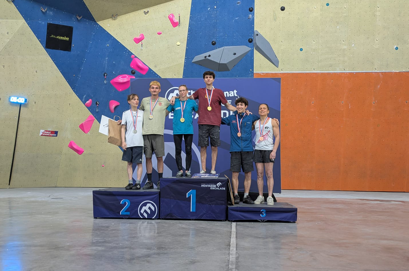 Après un début de saison très performant, Max BERTONE (Austral Roc) continue sur sa lancée. Il remporte les qualifications, et les demies en « toppant » toutes les voies. En finale, il monte également le plus haut, à égalité avec Jules MARCHALAND. Le jeune athlète du Pôle Espoir ayant remporté les demi-finales, c’est à lui que revient le titre. A 18 ans, Max remporte ainsi son premier de Champion de France sénior, avant de reprendre la préparation pour la suite de la saison internationale