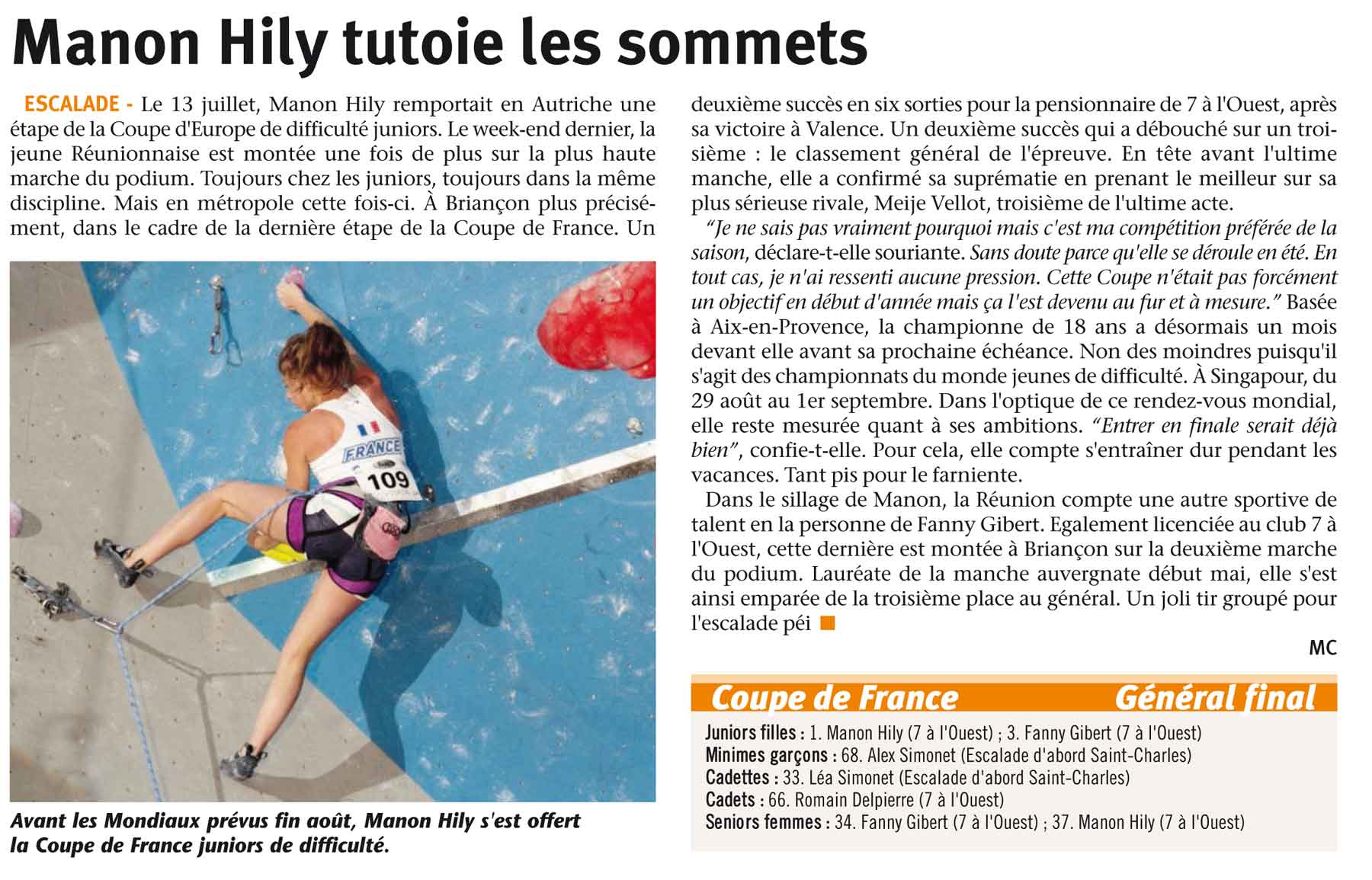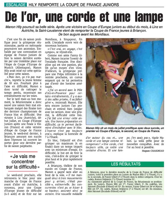 Un grand bravo à Manon Hily (7ALOUEST) qui remporte la Coupe de France de Difficulté jeun 2012, suivi de près par Fanny Gibert (7ALOUEST) qui se retrouve à la troisième place.