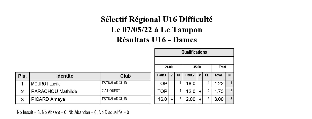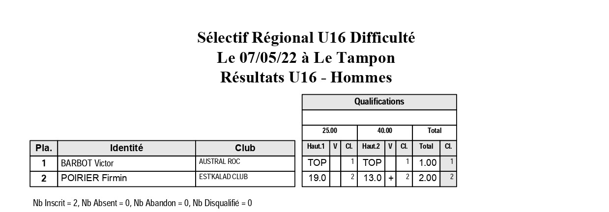 Suite au sélectif régional U16 de difficulté du samedi 7 mai 2022 au Tampon, tous les grimpeurs présélectionnés pour les championnats de France de difficulté  sont connus.