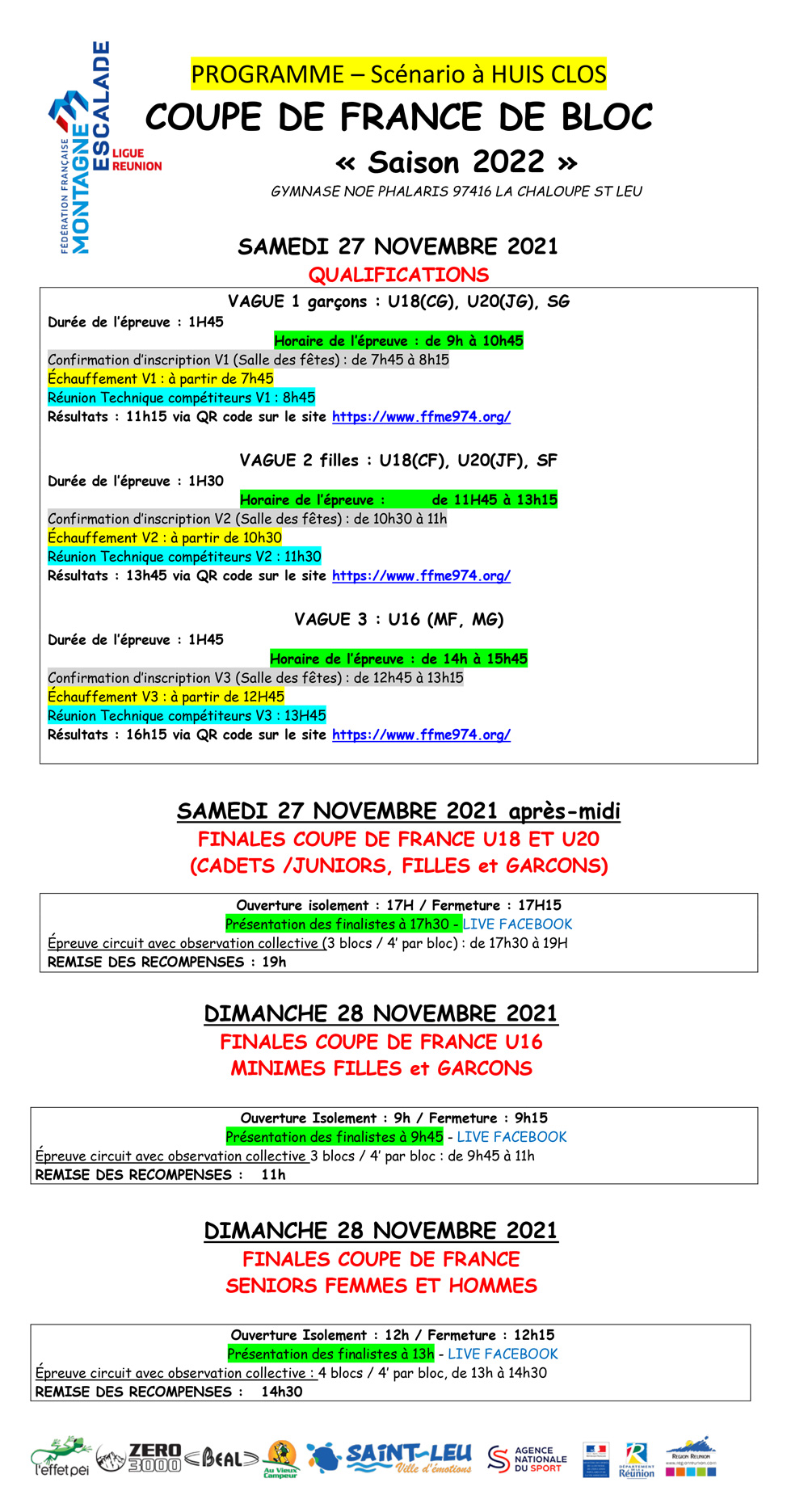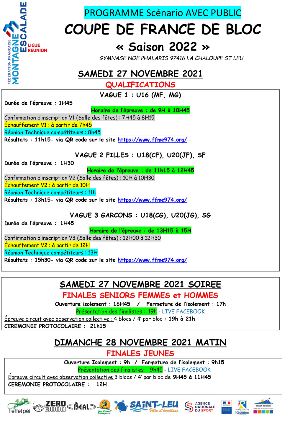 En date du 19 novembre 2021, l’arrêté préfectoral en cours, sur lequel nous devons nous appuyer pour préparer l’évènement, expire le 21 novembre 2021 et sera remplacé par un nouvel arrêté prochainement. Bien sûr, nous ne souhaitons pas un durcissement des mesures en vigueur sur notre île, mesures qui impacteraient l’organisation de notre compétition.