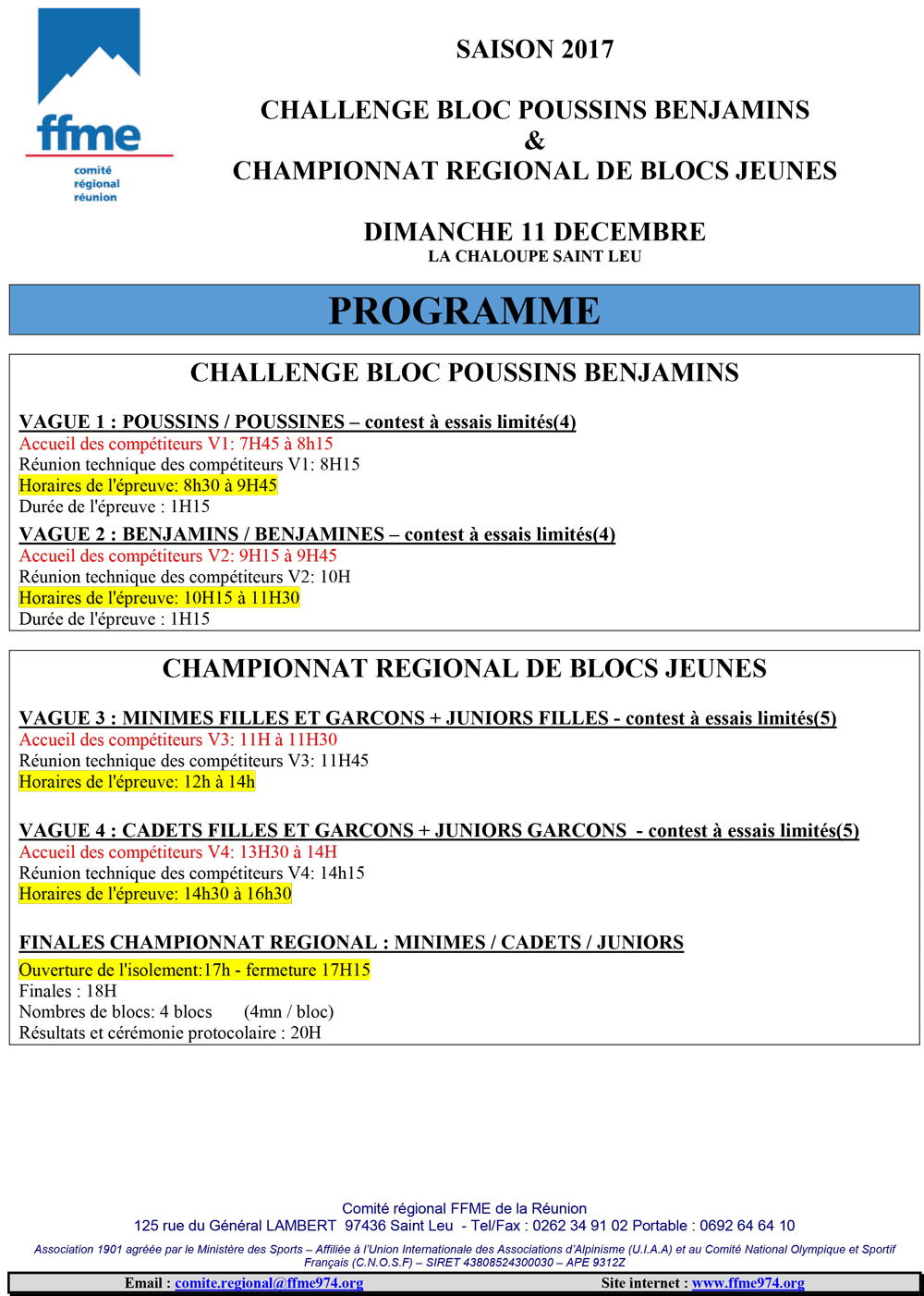 Cette année , nous proposons aux meilleurs benjamin(e)s de venir s’essayer à la compétition de difficulté lors des Championnats Régionaux de Difficulté qui se dérouleront le Dimanche 19 mars 2017 sur le mur d’escalade du Club Montagne Réunion à la Possession.