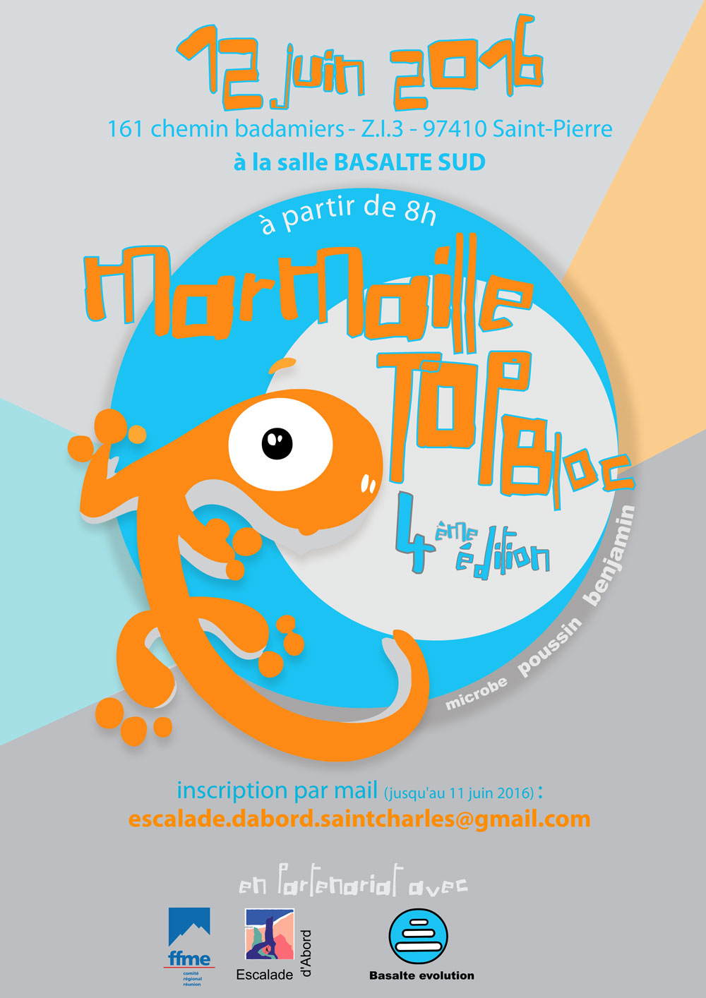Le club Escalade d’Abord Saint Charles organise la 4ème Edition du « Marmailles Top Bloc », compétition de bloc pour les catégories Microbes, Poussins et Benjamins le dimanche 12 Juin 2016 à la salle de Basalte Evolution (St Pierre Z.I. 3 / 161 chemin Badamier Z.I.3, 97410 Saint Pierre).
