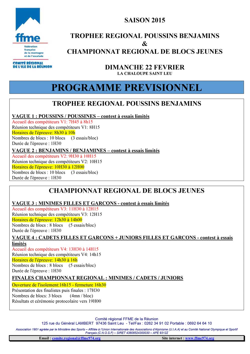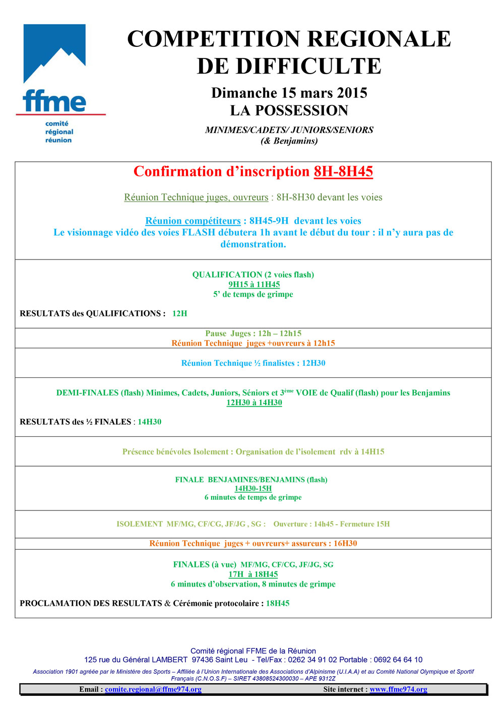 « Une fois n’est pas coutume, la compétition régionale de difficulté qui se tiendra le dimanche 15 mars 2015 sur la SAE du complexe sportif de La Possession, sera dépourvu de stand buvette… Ne pleurez pas, nul doute que vous retrouverez les crêpes Montagne Réunion, de renommée internationale, à l’occasion d’un prochain évènement dans les lieux…
