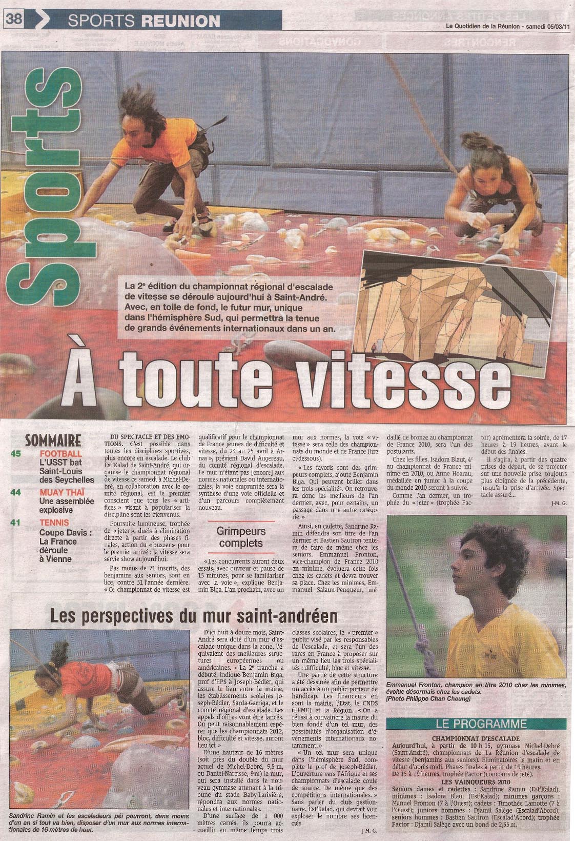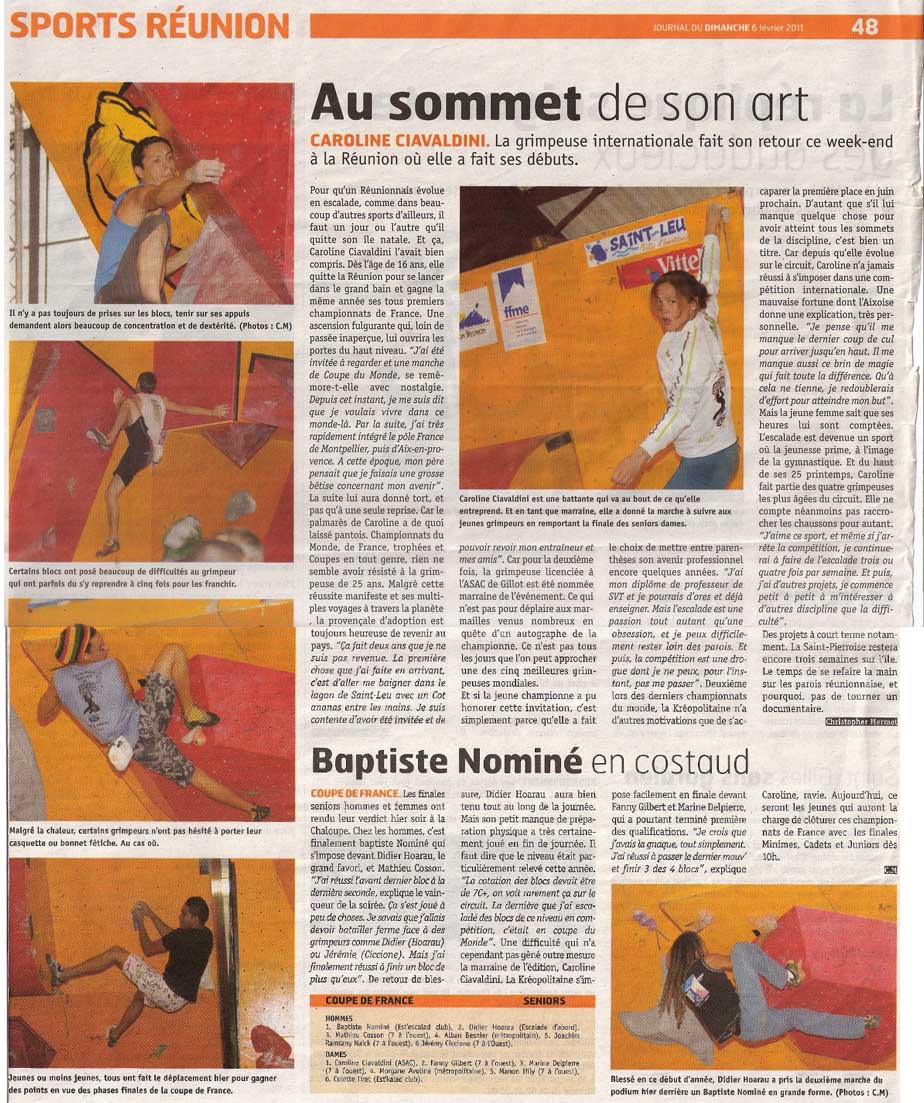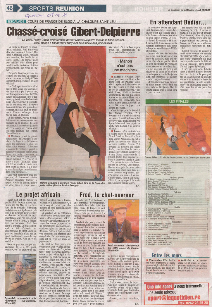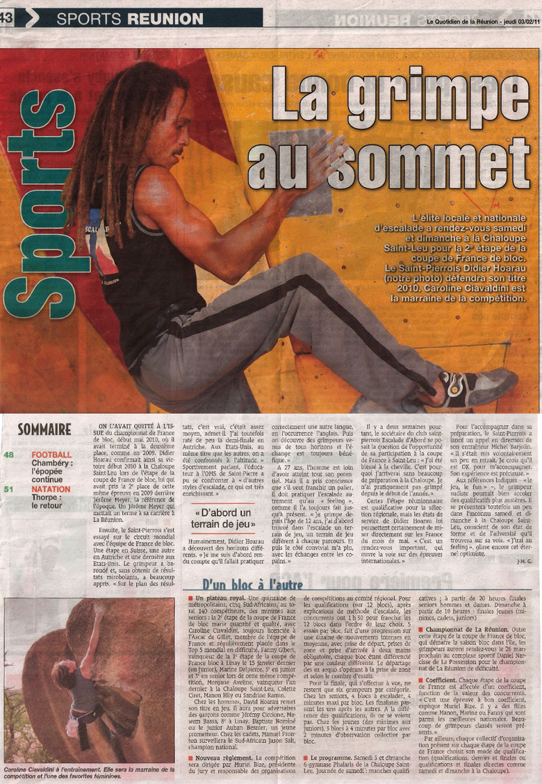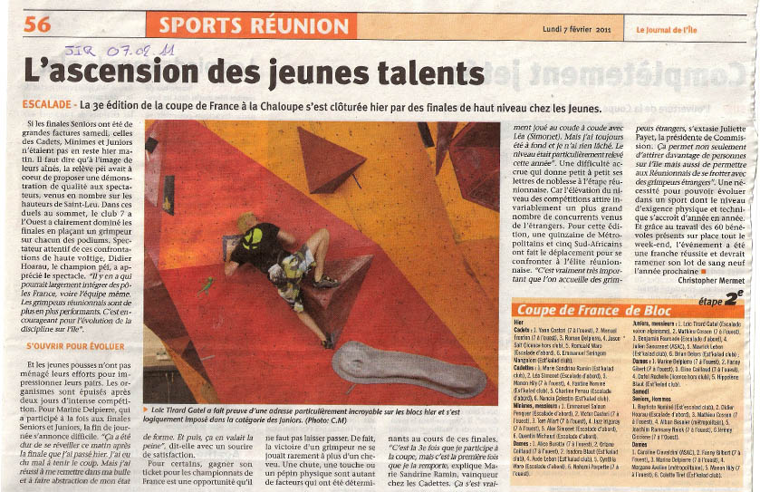 Les 05 et 06 février 2011, se déroulera pour la 3ème année consécutive, la seconde étape sur les quatre de la Coupe de France d’escalade de bloc au gymnase V PHALARIS de la Chaloupe Saint Leu.