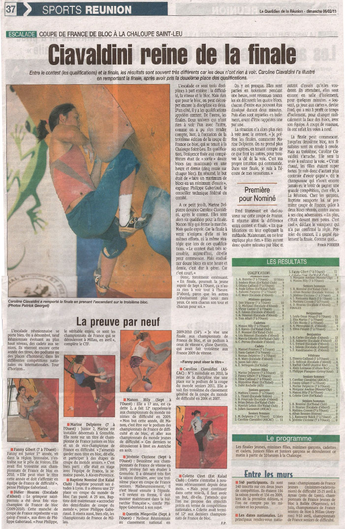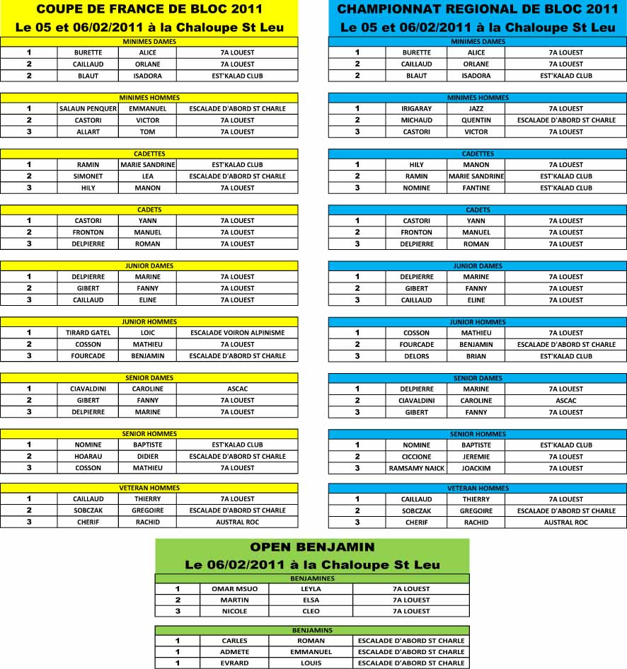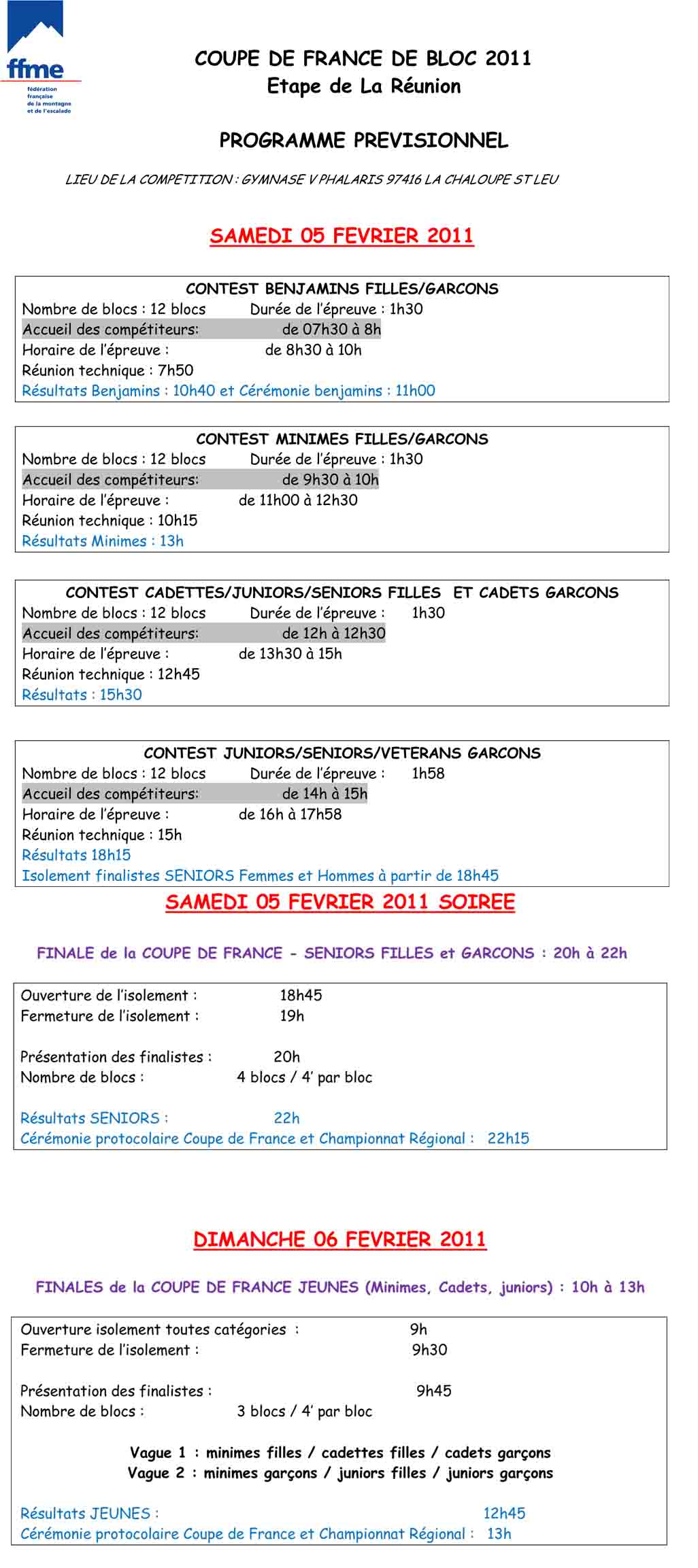 La Coupe de France de blocs 2011 se déroulera le samedi 05 et dimanche 06 février 2011 au gymnase de La Chaloupe.