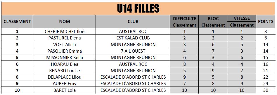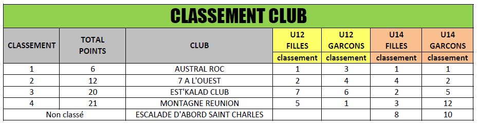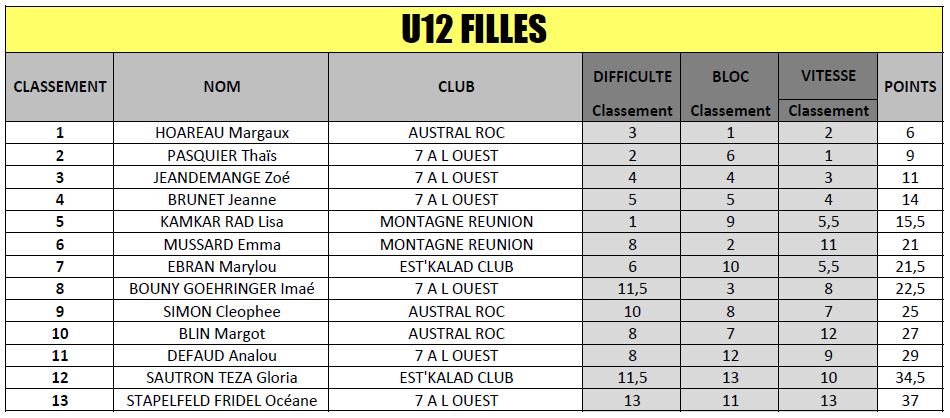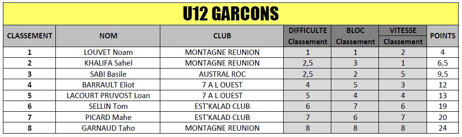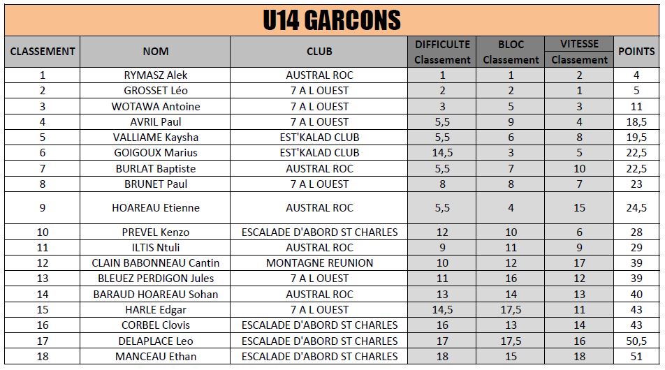 Cette compétition est un combiné, il est obligatoire de faire les trois épreuves (bloc, difficulté et vitesse) pour être classé